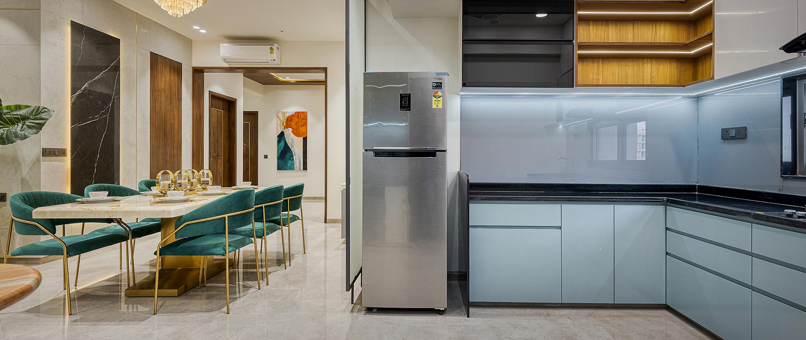 We use premium-quality materials such as Italian marble, rich hardwoods, plush fabrics, designer wallpapers, and high-end finishes for a refined aesthetic.
